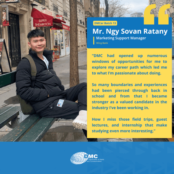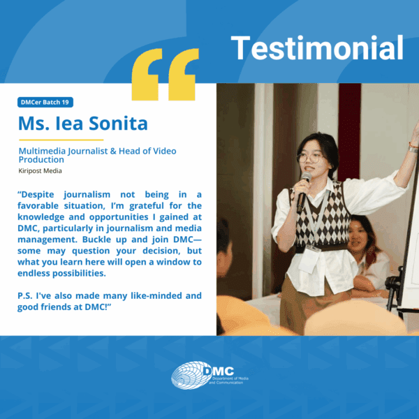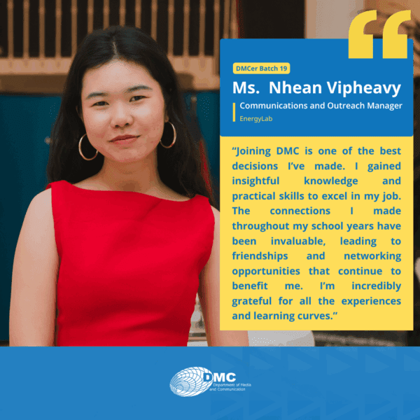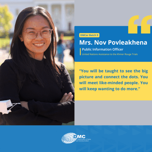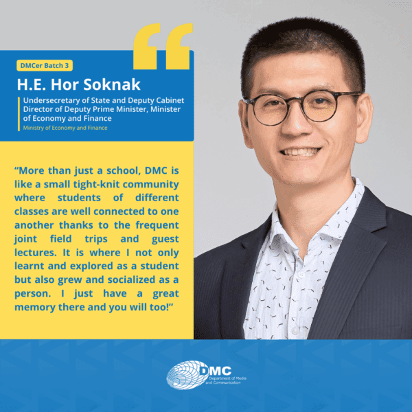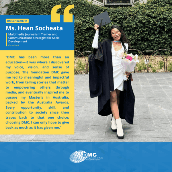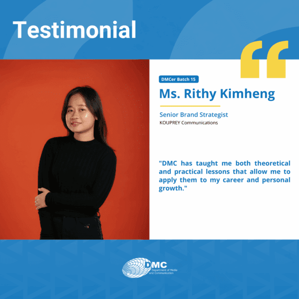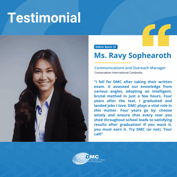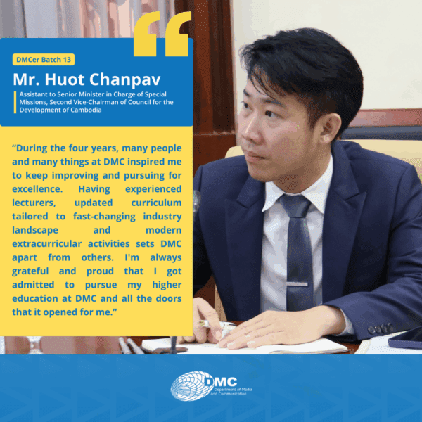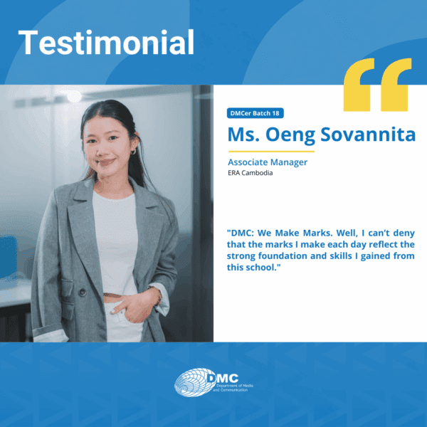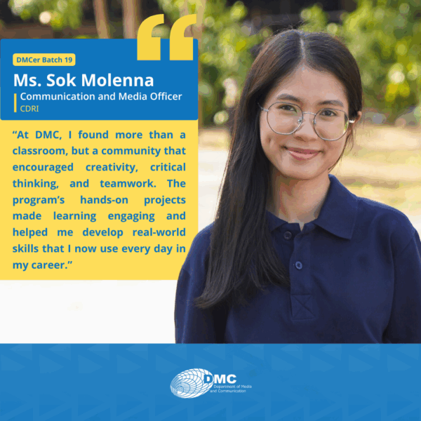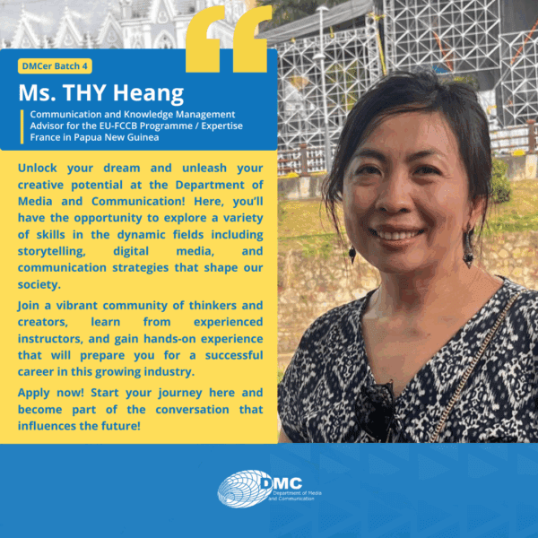The Department of Media and Communication (DMC) was established in 2001, under the Royal University of Phnom Penh, primarily as an academic training ground for communication, journalism, and media education in Cambodia.